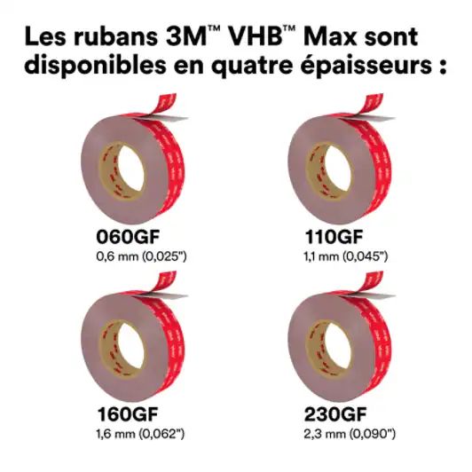 Le 3M™ VHB™ Tape Max Series est un ruban de mousse adhésive acrylique double face haute performance conçue pour remplacer les fixations mécaniques traditionnelles, certaines formes de soudage et les adhésifs liquides. Ruban en mousse adhésive acrylique le plus résistant de la gamme de rubans 3M™ VHB™ : ce ruban est conçu pour les applications plus exigeantes, tout en simplifiant la production en éliminant le besoin de perçage, de soudage et de nettoyage ultérieur. La polyvalence est également une caractéristique clé de cette série de rubans, car elle offre une excellente adhérence sur une large gamme de matériaux, tels que les métaux et les substrats à haute énergie de surface. Cela crée une finition lisse et invisible pour une esthétique améliorée. Utilisez la série 3M™ VHB™ Tape Max avec le primaire d'adhésion 3M™ VHB™ Tape Max pour garantir une résistance d'assemblage adéquate sur une variété de surfaces et de conditions environnementales.